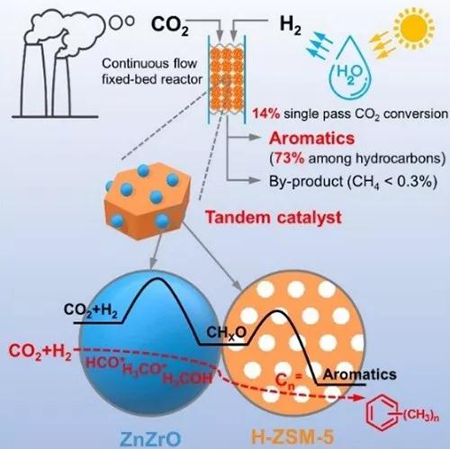 因此,利用可再生能源的氫將CO2轉(zhuǎn)化為具有高附加值的芳烴,使CO2以聚合物材料的形式儲存下來,既可以實現(xiàn)CO2碳資源化利用,又可以起到減排CO2作用,具有重要的戰(zhàn)略意義。然而,CO2在熱力學(xué)上是惰性的分子,實現(xiàn)CO2的活化和高選擇性的轉(zhuǎn)化存在較大的困難和挑戰(zhàn)。