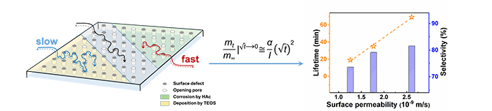 該團隊利用化學液相沉積法與酸蝕技術(shù)修飾了SAPO-34分子篩的晶體外表面。根據(jù)前期所提出的表面滲透率公式,該團隊直接測定了修飾前后的分子篩的表面滲透率,定量得到了分子篩的表面?zhèn)髻|(zhì)阻力。與此同時,采用該方法修飾分子篩外表面過程中,分子篩形貌、內(nèi)部孔道結(jié)構(gòu)、酸性質(zhì)與晶內(nèi)擴散性質(zhì)幾乎不變。研究發(fā)現(xiàn),控制相關(guān)客體分子在分子篩晶體上的表面?zhèn)髻|(zhì)能力,降低其表面阻力,有助于加快客體分子進出分子篩晶體,最終實現(xiàn)延長分子篩壽命,提高低碳烯烴選擇性。